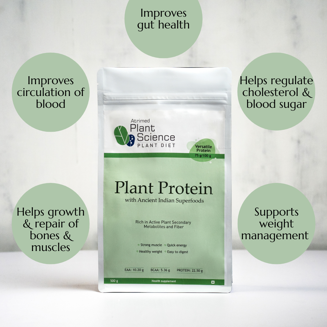 A carefully crafted plant protein powder by our Plant Scientists aims to supplement the body's protein requirement. In addition, it has ancient superfoods missing from your diet that have countless health benefits. Being rich in active plant secondary metabolites and fibres, it helps maintain a healthy gut microbiome. With 75g of protein for every 100g, this versatile plant protein powder is a must try for daily consumption.