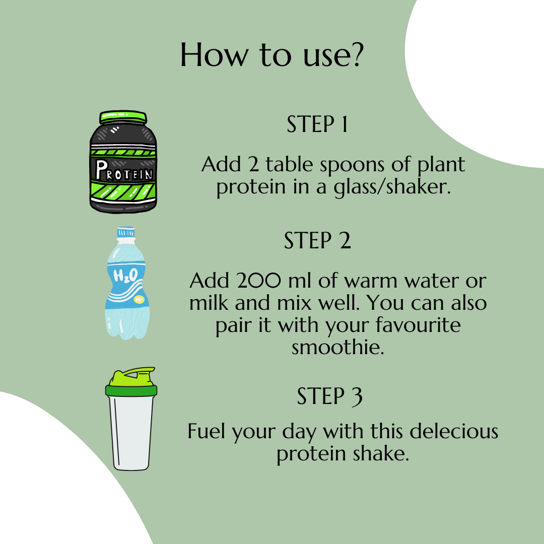 Directions of use : Add 200ml of warm water/plant milk into a glass with 2 tablespoons (1 serving) of Plant Protein Powder or blend it with your favorite smoothies (we happen to be a fan of banana smoothie!).