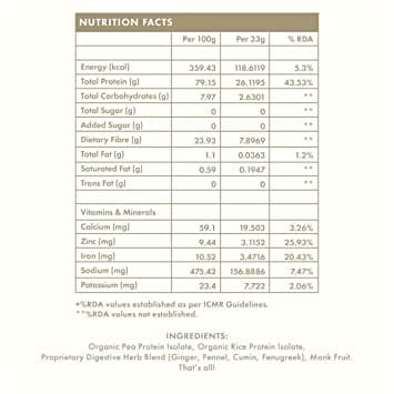 Ingredients : Grade A+ Organic pea protein isolate, Grade A+ Organic rice protein isolate, Proprietary digestive herb blend (Ginger, Fennel, Cumin, Fenugreek). That’s all!