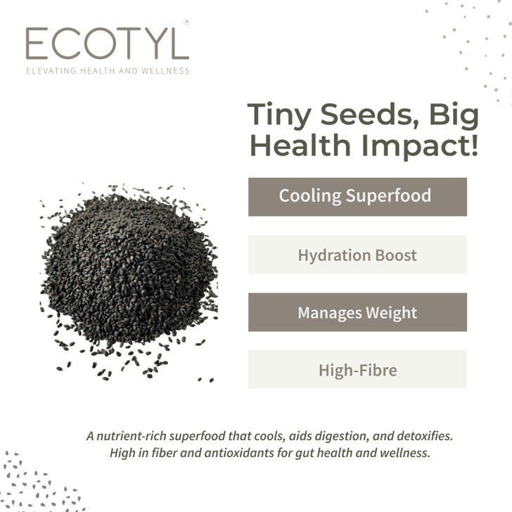 Ecotyl’s Basil Seeds, also known as sabja seeds, are nature’s answer to cooling hydration. When soaked, these tiny black seeds swell into a gel-like consistency, offering a refreshing texture along with natural goodness