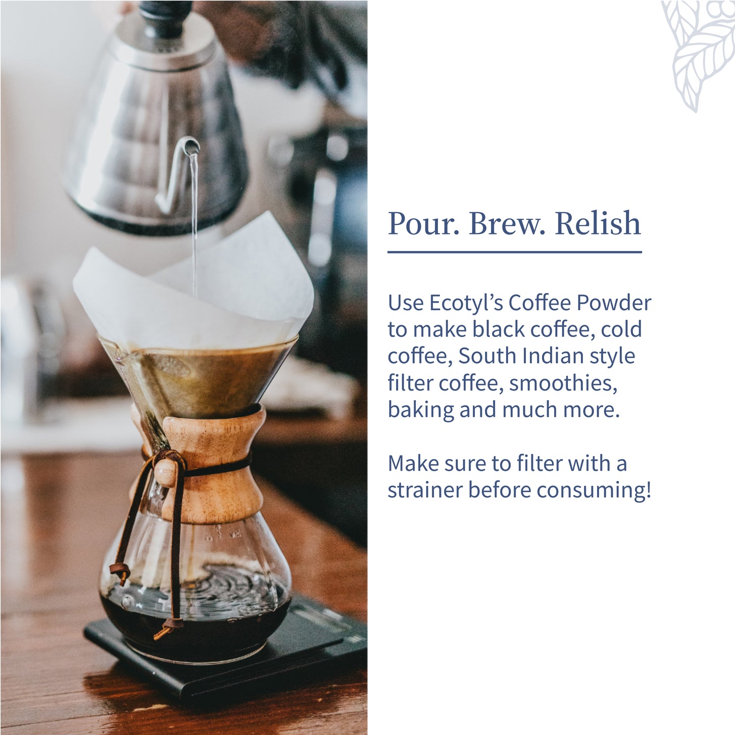 For people who always crave a perfect kick from their morning cup of coffee, Ecotyl’s Coffee is the best choice - a rich blend of premium Arabica coffee grounds, delivering the perfect cup of South Indian filter coffee goodness! It unfolds a brew of strength, flavour and a fine taste. Made from the finest Arabica beans and expertly roasted, our coffee powder promises a flavorful and aromatic experience that transcends the ordinary.So, expect more from your cup of coffee that promises deliciousness in every sip!