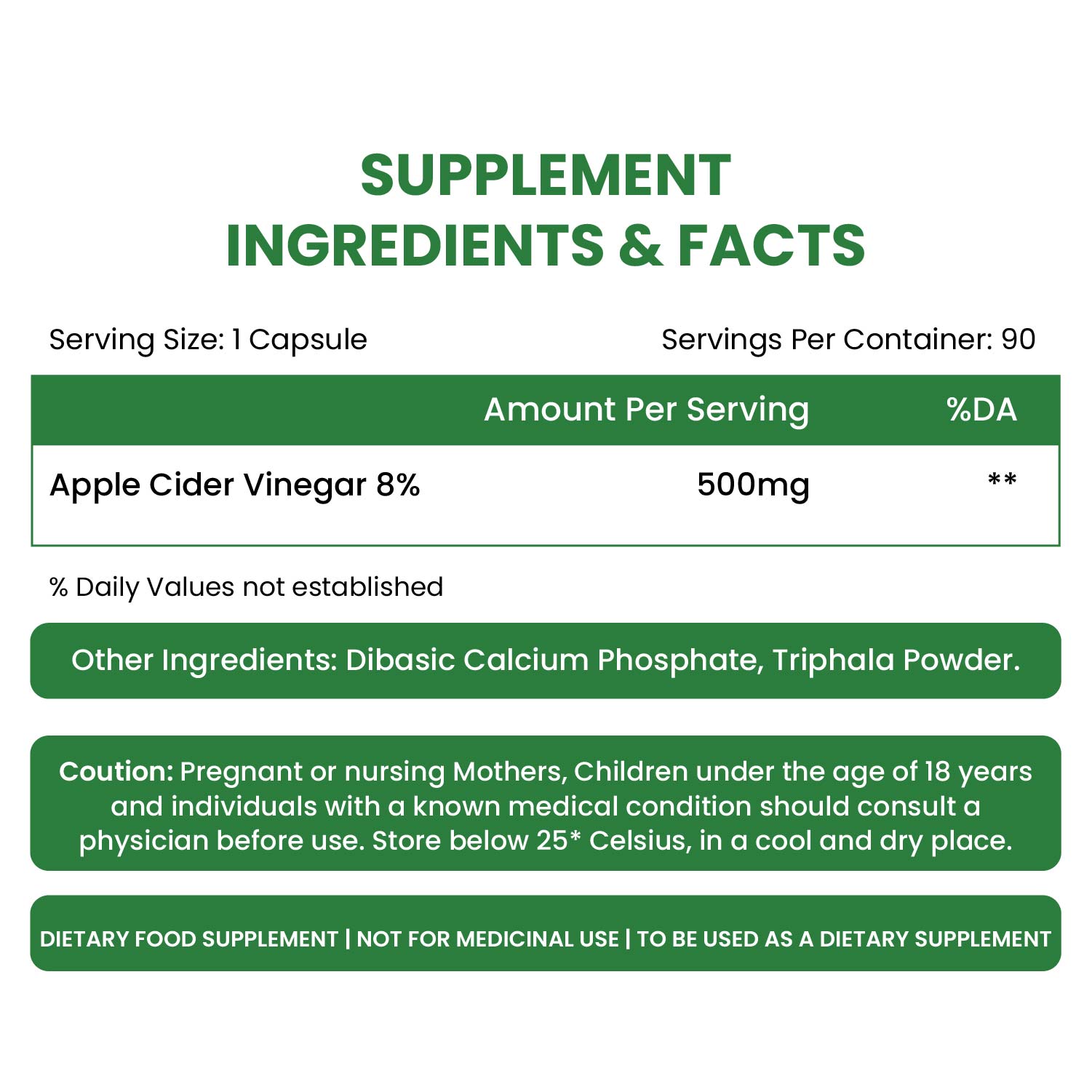 - Active Ingredient: Apple Cider Vinegar 8% – 500 mg