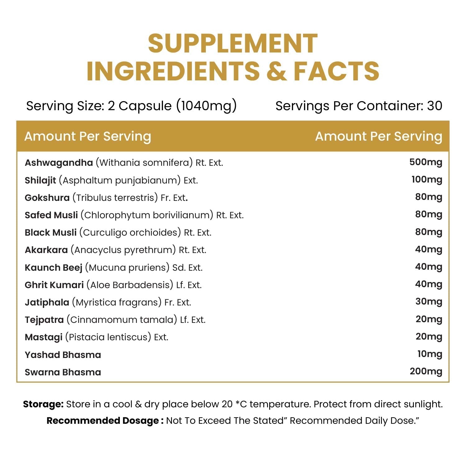 INGREDIENTS- Ashwagandha Root, Black Musli Root, Gokshura Fruit, Kaunch Beej Seed, Shilajit, Swarna Bhasma
