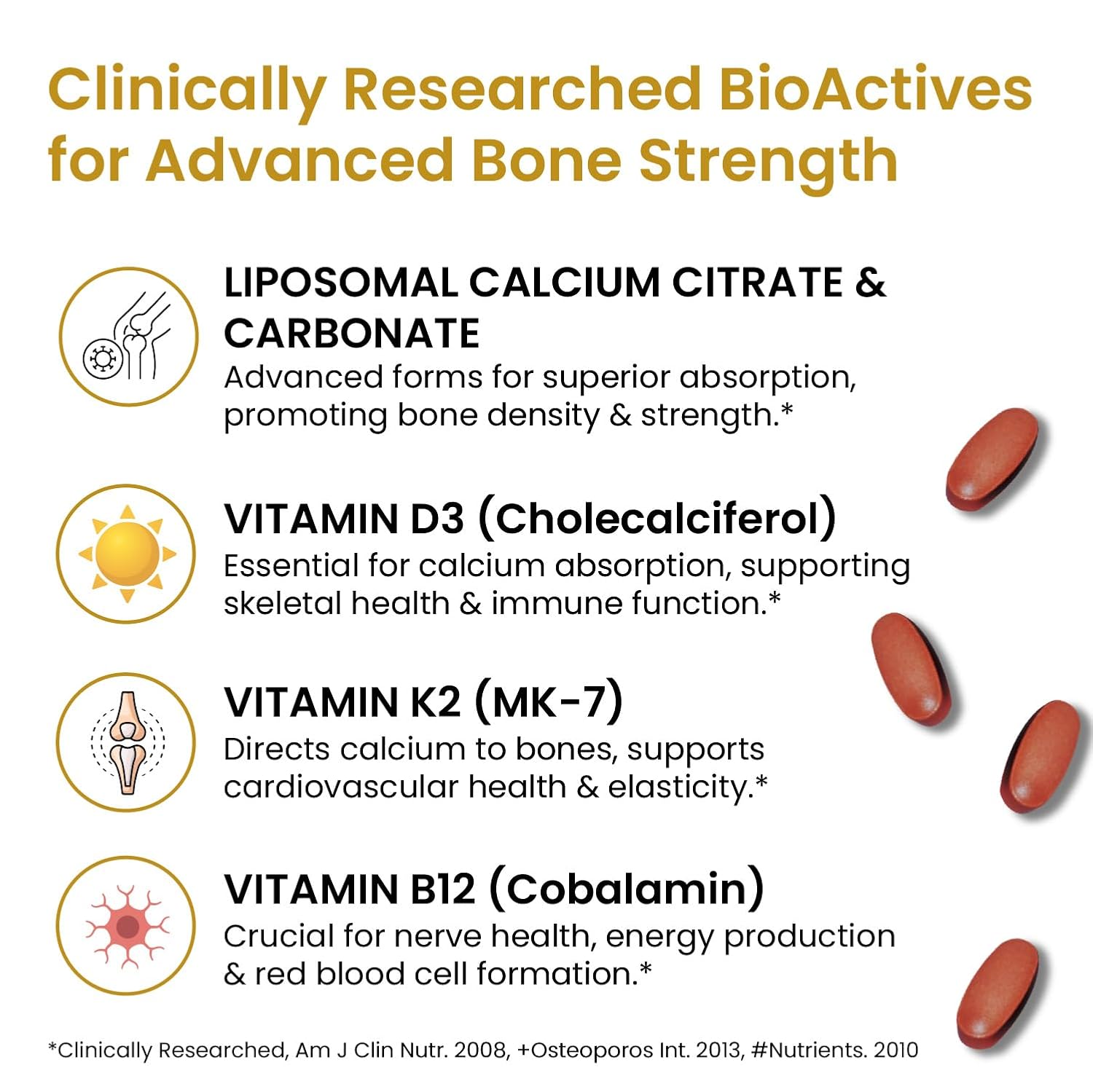 The formulation includes liposomal Calcium along with Vitamins D3, K2 (MK-7), and B12—nutrients commonly included in everyday nutrition. The liposomal technology is designed to improve nutrient uptake and utilization as part of a balanced diet. Vitamin B12 is an essential micronutrient widely used in daily nutritional supplementation.