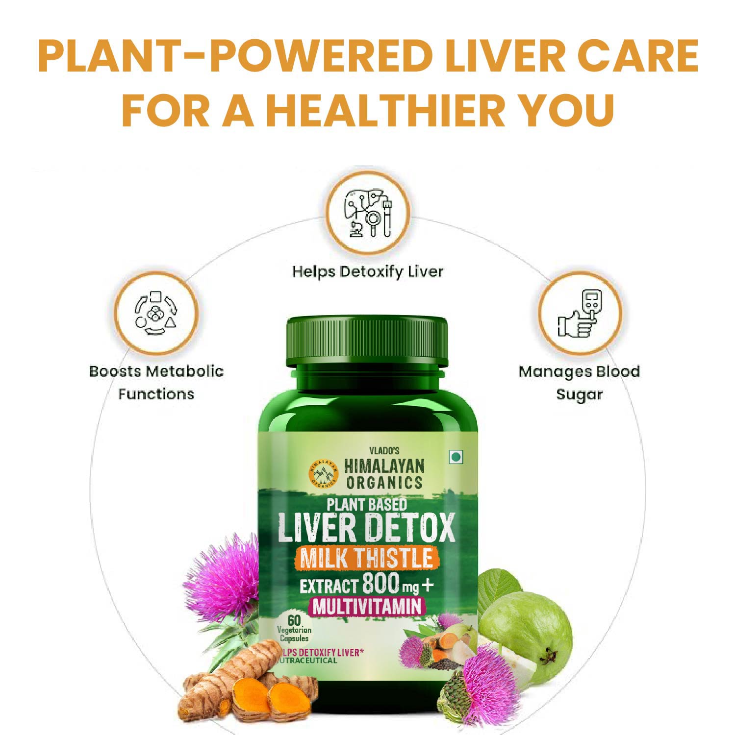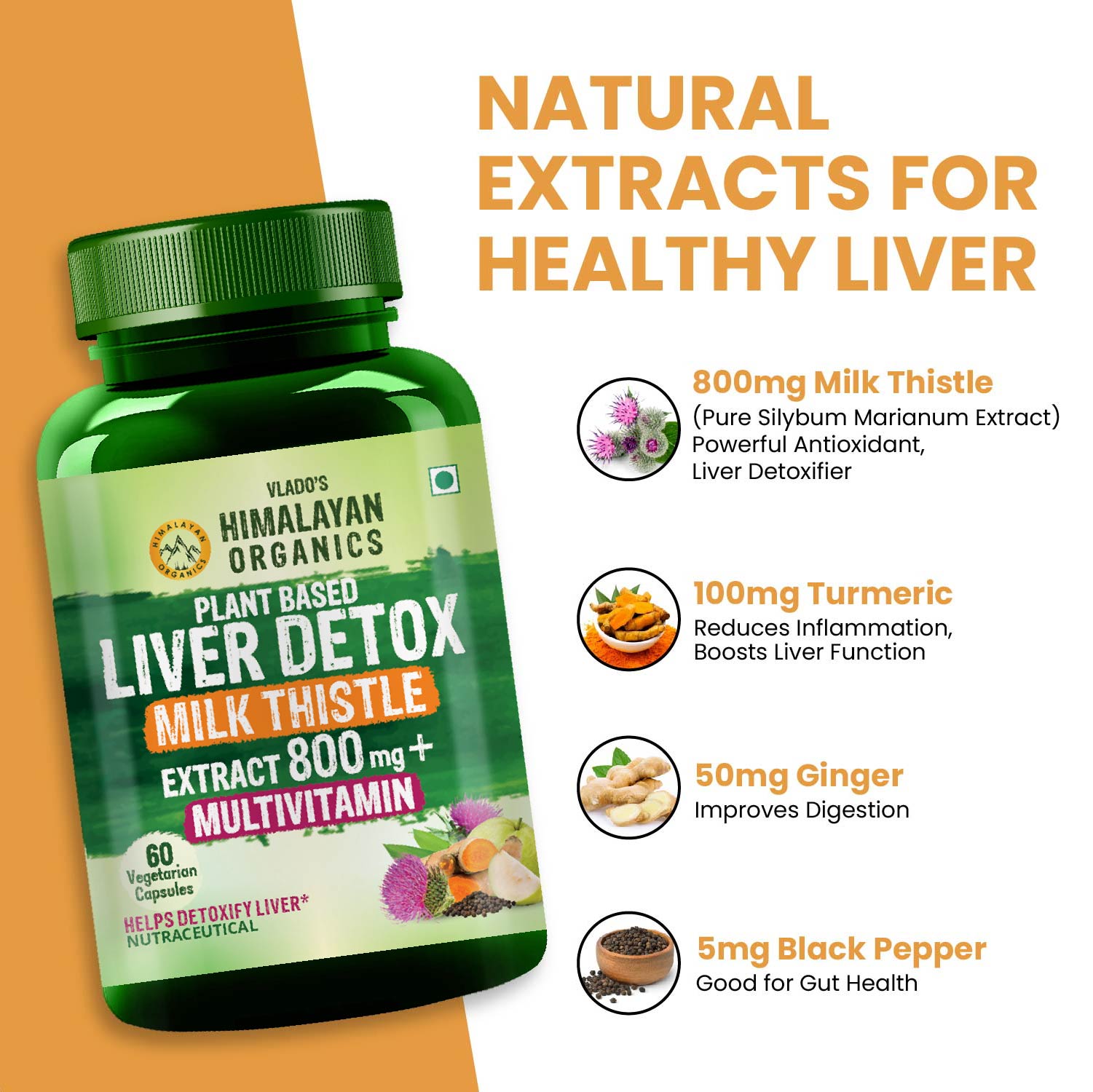 Description- Vlado's Himalayan Organics Plant-Based Liver Detox is a powerful herbal supplement with 800mg Milk Thistle (30:1 extract) per serving. Designed for both men and women, it supports natural liver cleansing, boosts detoxification, and promotes overall liver health. 100% vegan and easy-to-digest with 60 veg capsules.
