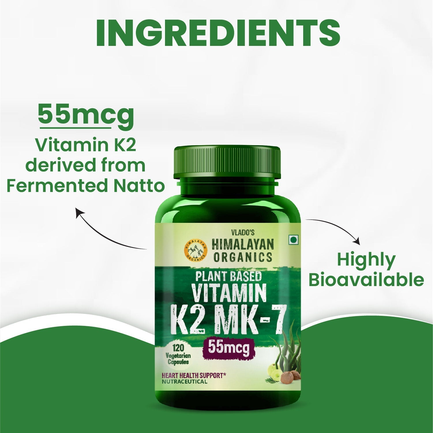 Vlado's Himalayan Organics Plant-Based Vitamin K2 MK- 7 Supplement 55 MCG / Serving - k2 supplements for Men & Women - 120 Veg Capsules