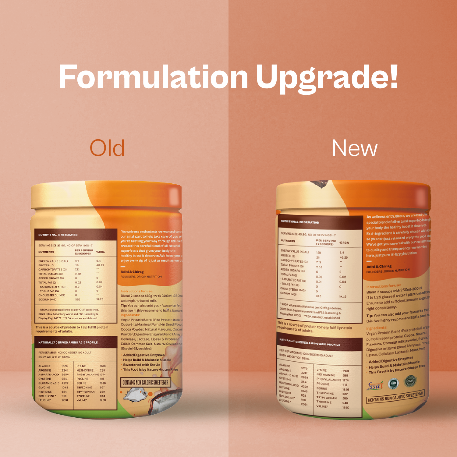 Origin Protein is made from a blend of premium European golden peas and cold-pressed organic pumpkin seeds. It is a complete protein with all nine essential amino acids, easy to digest and absolutely delicious. Each serving contains 25 grams of protein & 4 grams of naturally occurring BCAA. With a great tasting rich cocoa flavour, our protein powder is ideal for weight management and improving protein intake.