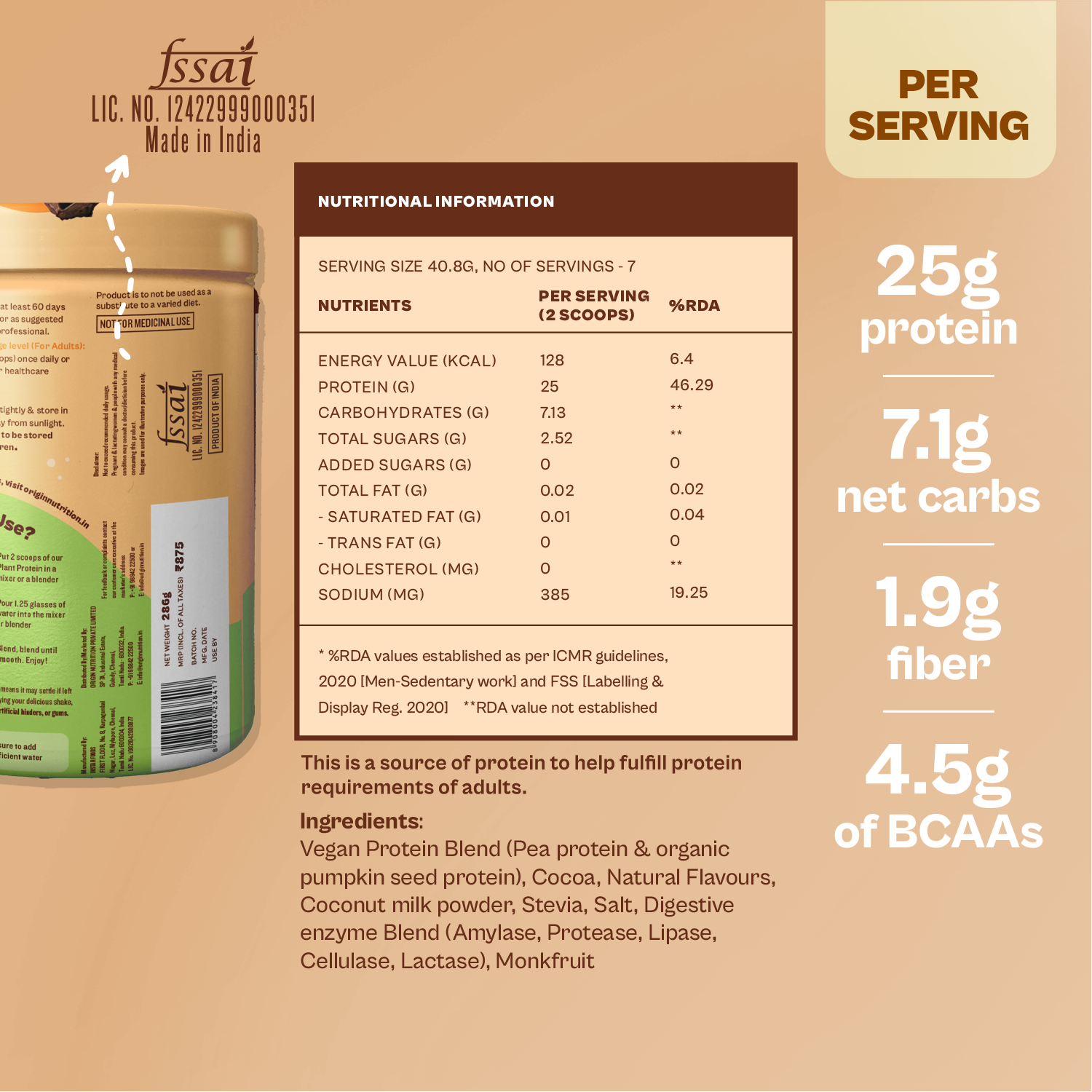 Ingredients: Vegan Protein Blend (Pea protein & organic pumpkin seed protein), Cocoa, Natural Flavours, Coconut milk powder, Stevia, Salt, Digestive enzyme Blend (Amylase, Protease, Lipase, Cellulase, Lactase), Monkfruit
