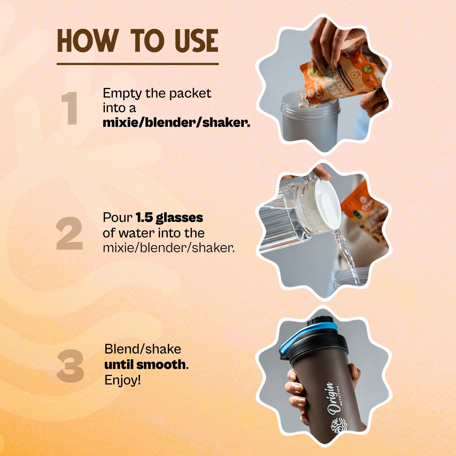 HOW TO CONSUME: Add 300ml water, empty your sachet, and blend/shake for a convenient plant protein pick-me-up!