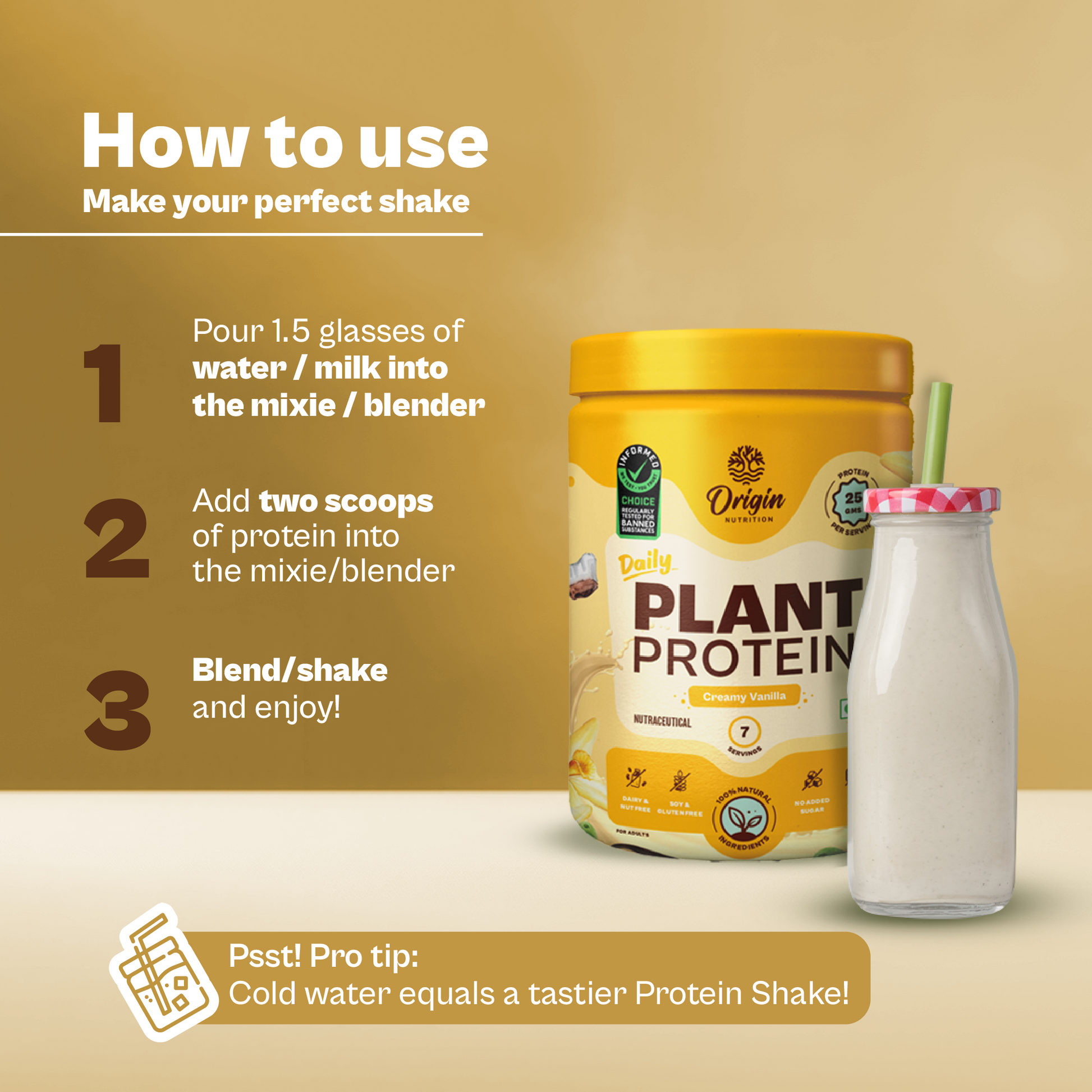 1. Shake: Blend two scoops of our Origin Nutrition Protein with 300-350ml/1.5 glass of water/plant-based milk & shake(we highly recommend ice-cold water for best taste).