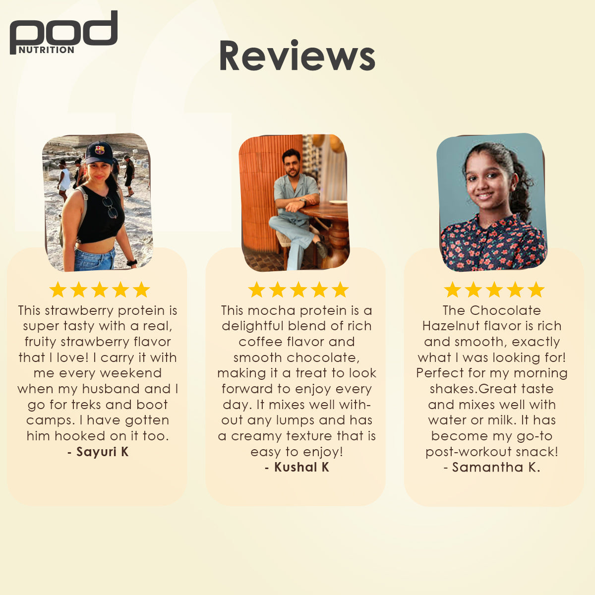 - Unlike most protein brands, Pod does not use any added flavours made in the lab. The flavours are only derived using the real fruits, nuts or the real plants thereby giving you the real taste.