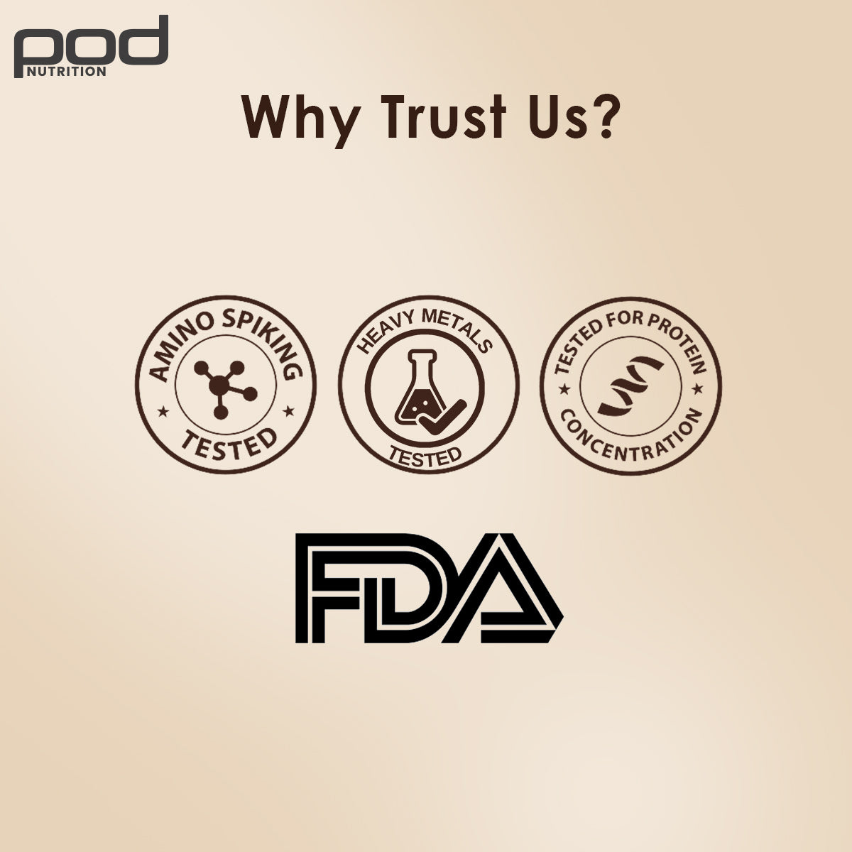 - Unlike most protein brands, Pod does not use any added flavours made in the lab. The flavours are only derived using the real fruits, nuts or the real plants thereby giving you the real taste.