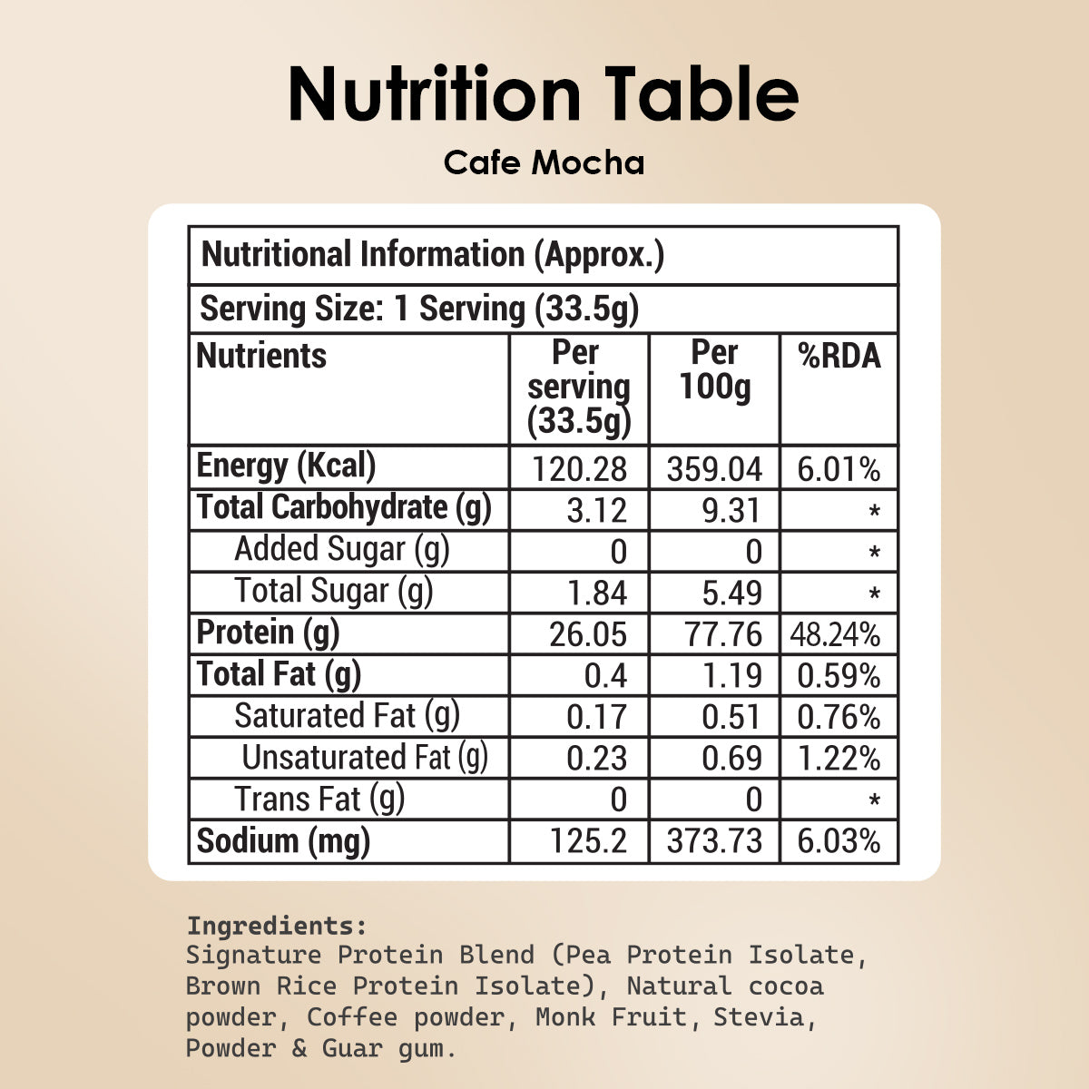 Ingredients: Pea & Brown rice protein, Natural Cocoa powder, Coffee powder, Stevia, Monk fruit, Guar gum
