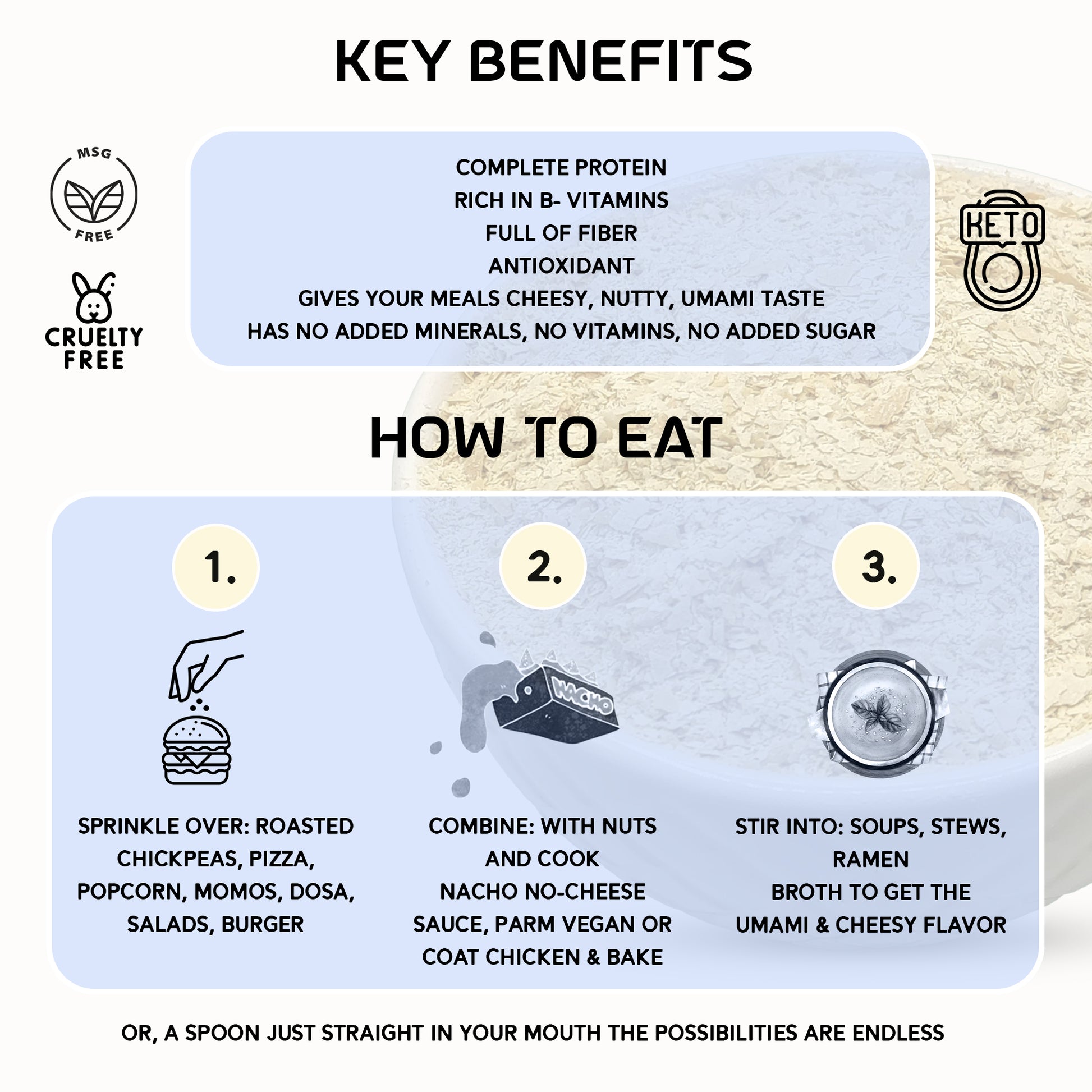 CREAMY, CHEESY-ONION FLAVOR – Delivers the nutty, cheesy taste of nutritional yeast with tangy sour cream notes and onion zest—perfect for popcorn, pasta, baked potatoes, and dips.