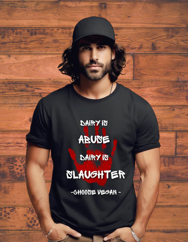 The Dairy is Abuse, Dairy is Slaughter T-Shirt makes a bold statement for animal rights and compassion. Made from 100% soft cotton, this tee is breathable, lightweight, and perfect for everyday comfort. With its striking “Dairy is Abuse, Dairy is Slaughter” print, it’s ideal for sparking conversations and spreading awareness about the truth behind the dairy industry.