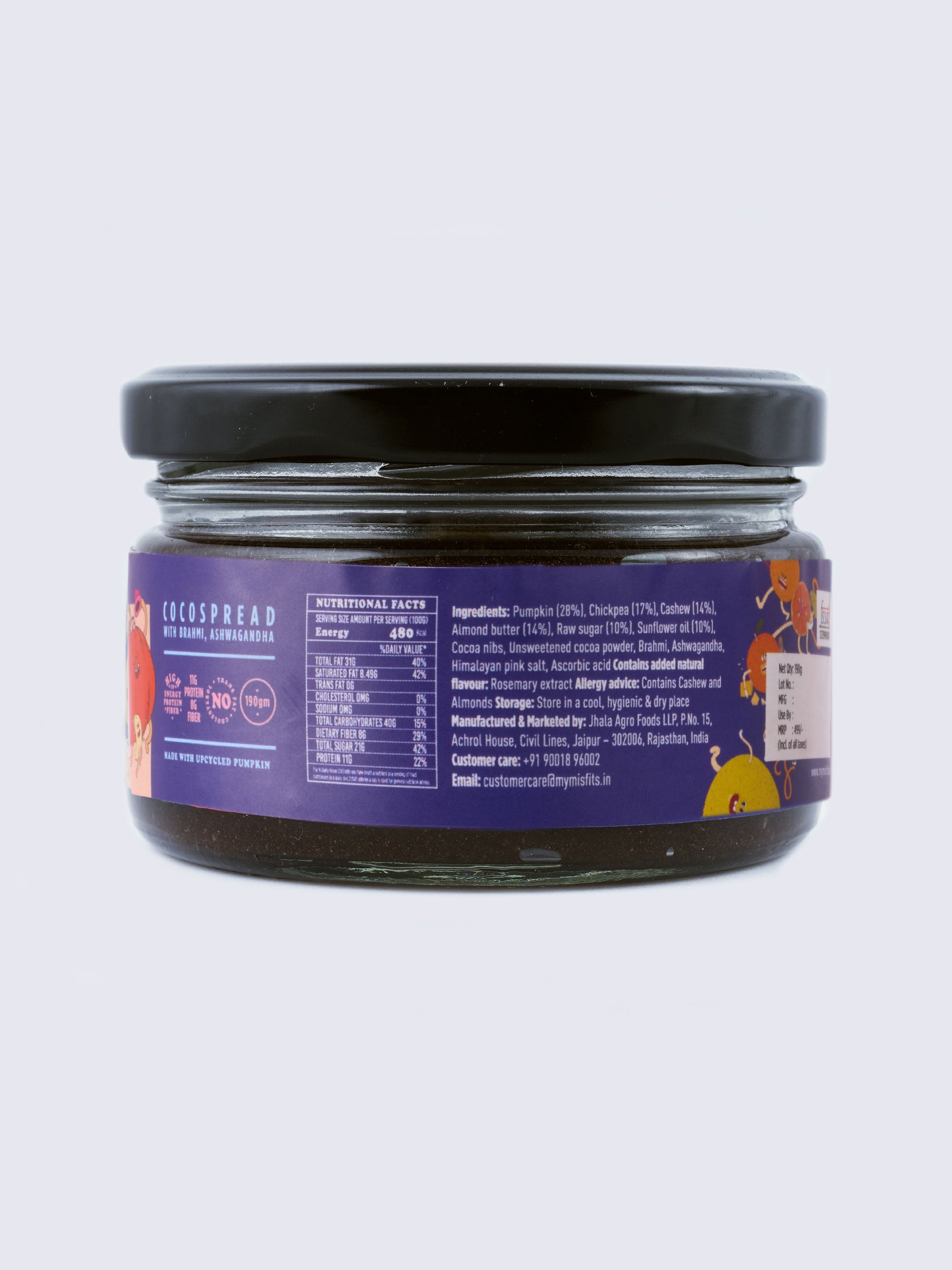 Ingredients: Pumpkin (28%), Chickpea (17%), Cashew (14%), Almond butter (14%), Raw sugar (10%), Sunflower oil (10%), Cocoa nibs, Unsweetened cocoa powder, Brahmi, Ashwagandha, Himalayan pink salt, Ascorbic acid
