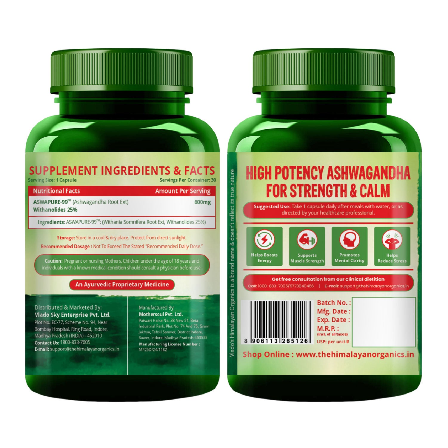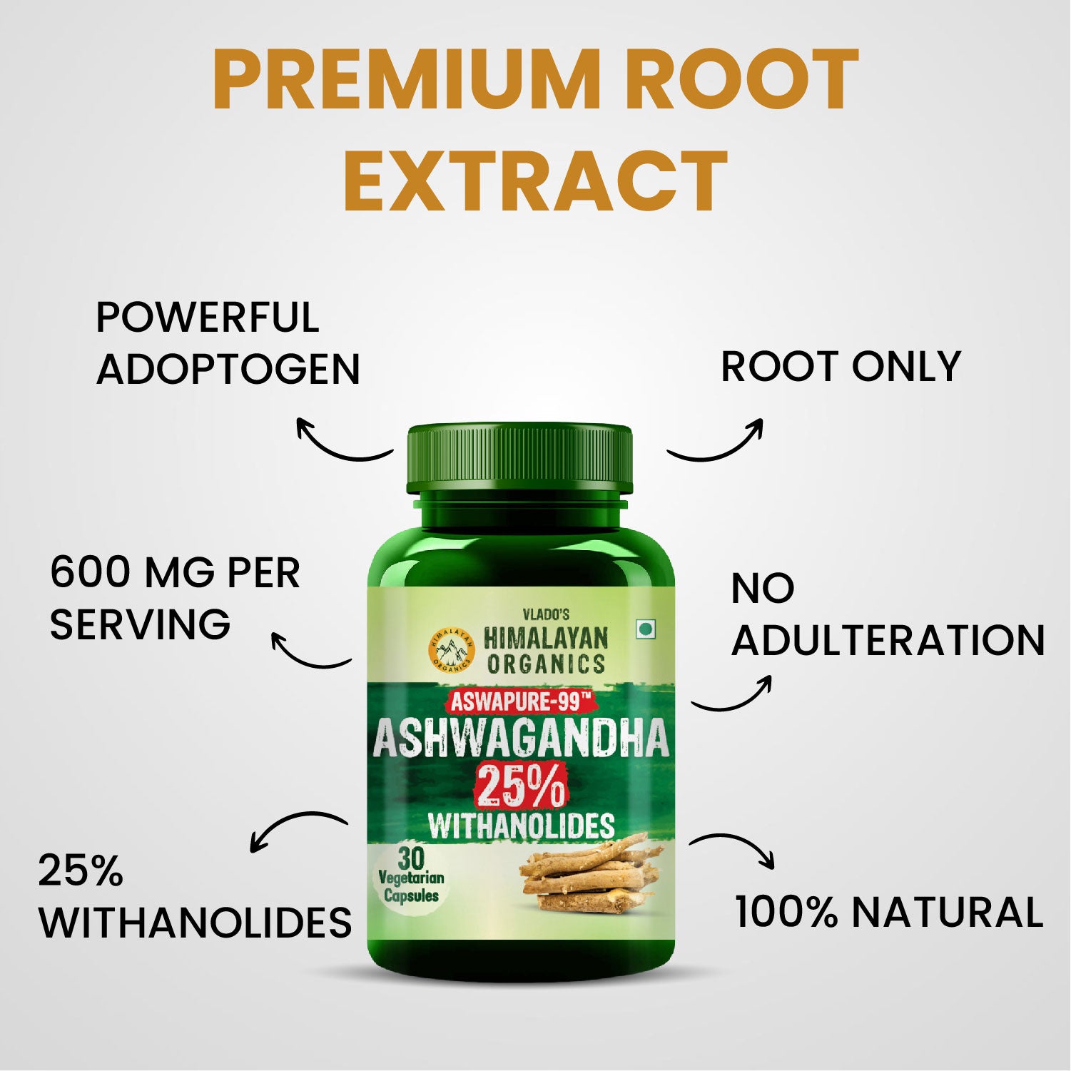 Vlado’s Himalayan Organics Ashwagandha 25% Withanolides – High-Potency 600 mg Extract – Lab-Tested | 30 Capsules