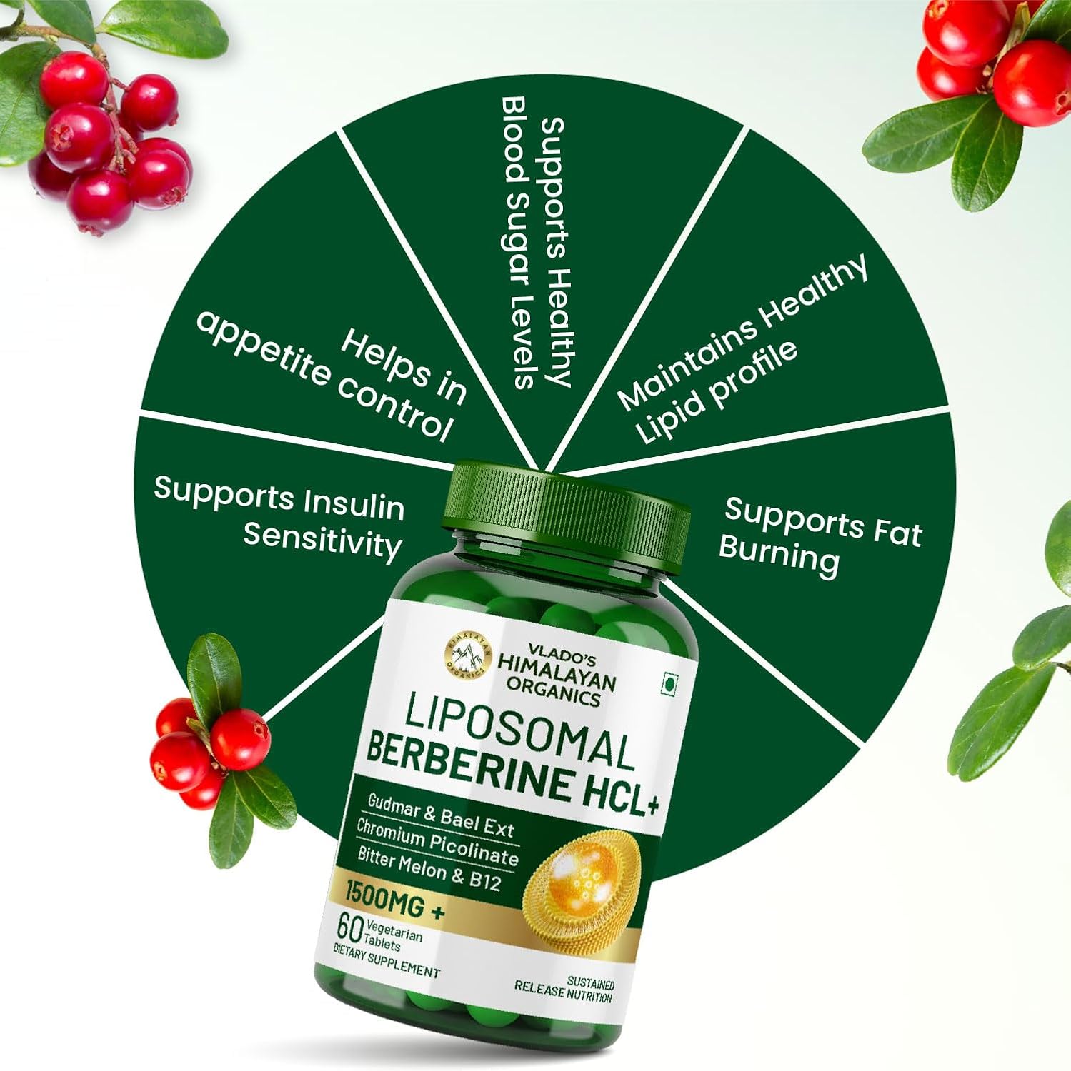 Vlado’s Himalayan Organics Liposomal Berberine HCL+ 1500 mg | With Piperine, Chromium, Bitter Melon, Bael & Gudmar | Advanced Herbal Blend | 60 Veg Tablets