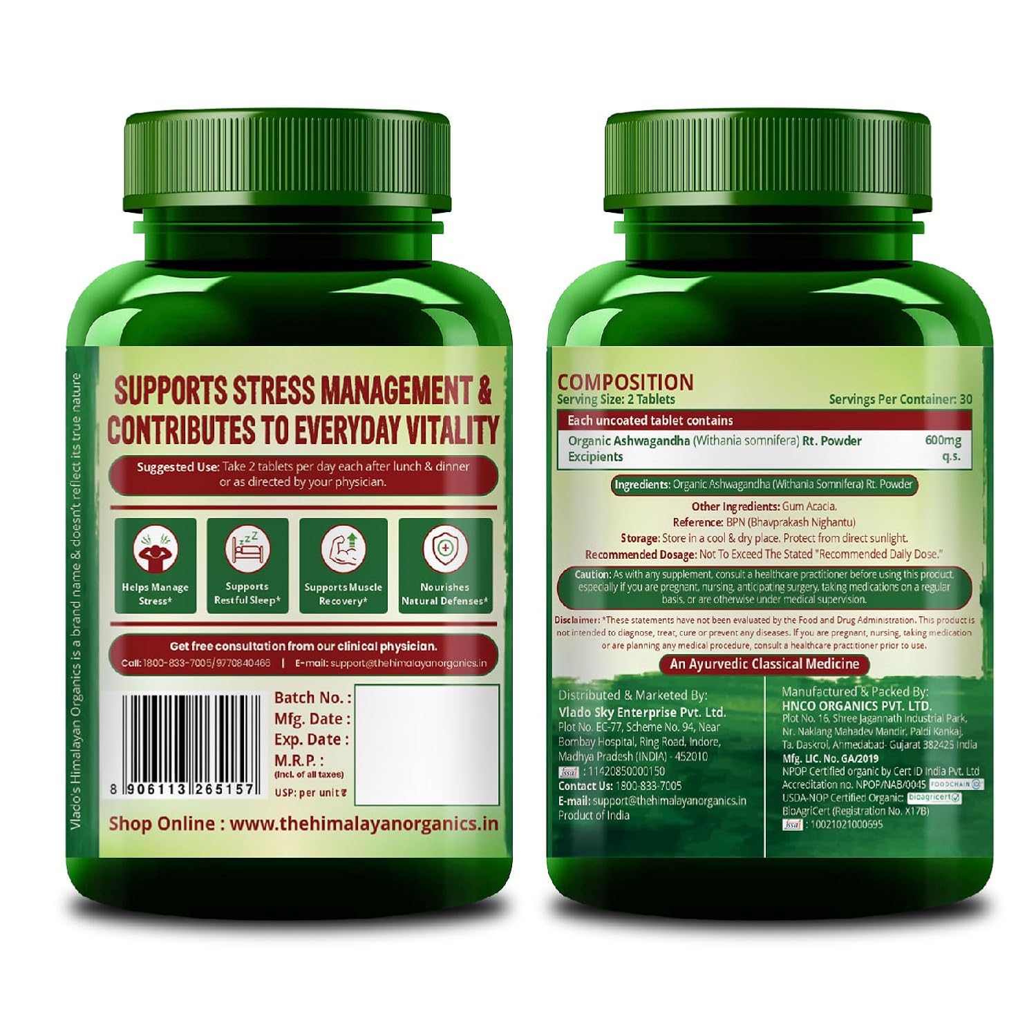 Vlado’s Himalayan Organics Organic Ashwagandha Tablets | 1200 mg High-Potency Root Extract | Pure Ayurvedic Formula | 60 Tablets