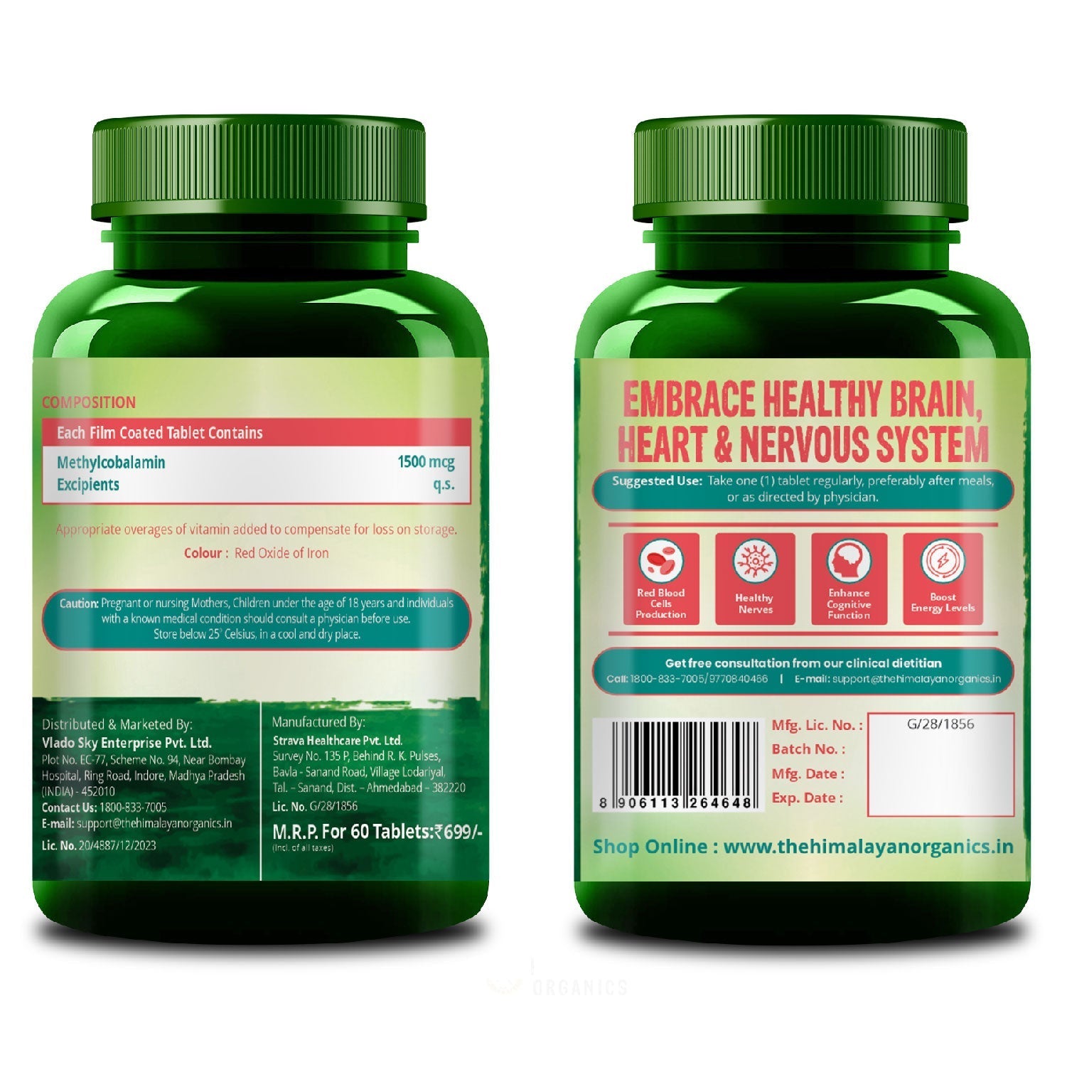 Vlado's Himalayan Organics Vitamin B12 Tablets 1500 mcg -Active form of Methylcobalamin Vitamin B12 Supplements for Men & Women- 60 Veg Tablets