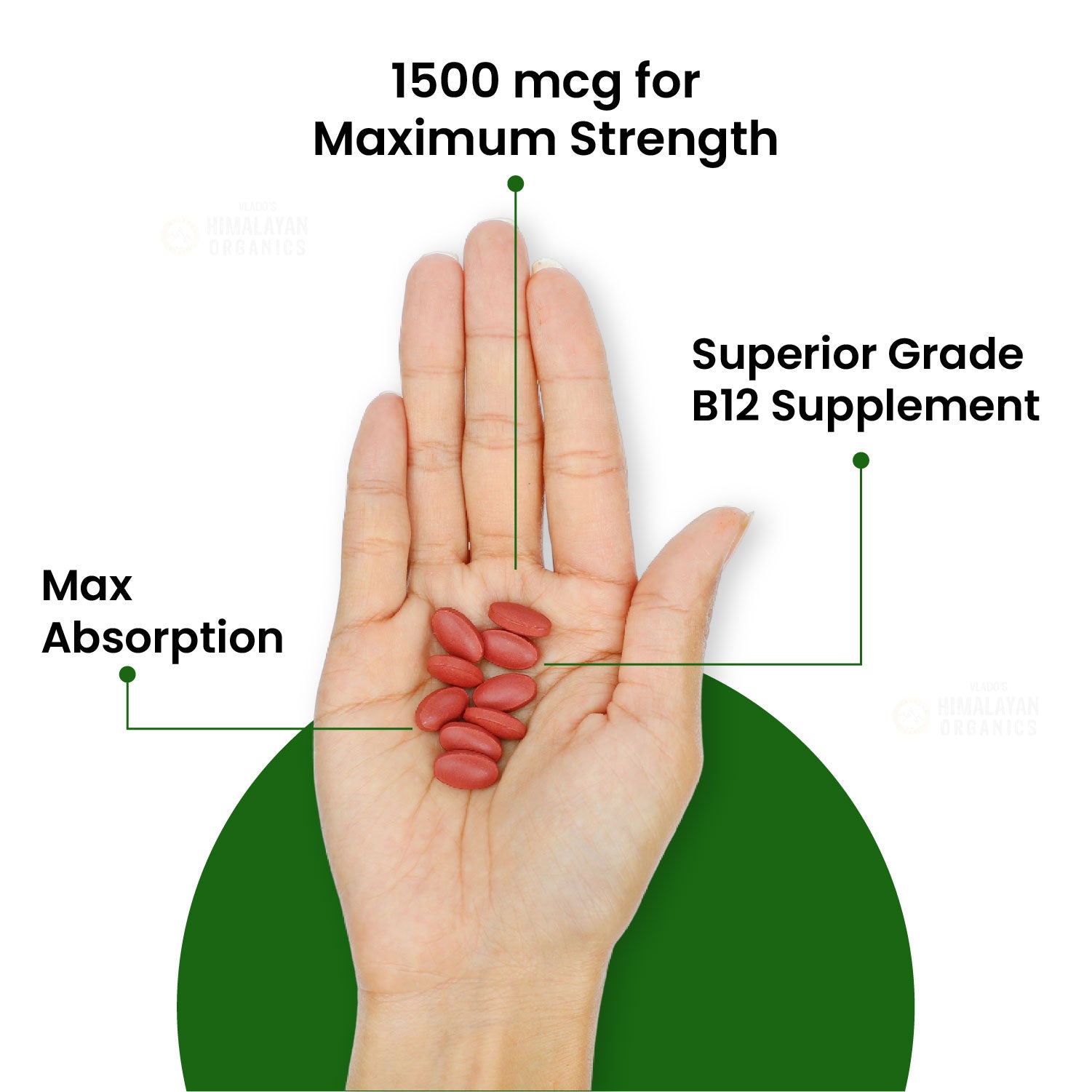 Vlado's Himalayan Organics Vitamin B12 Tablets deliver 1500 mcg of the active form Methylcobalamin, which is easily absorbed and utilized by the body. Specially formulated for both men and women, these vegan-friendly tablets help bridge nutritional gaps and support your overall well-being.