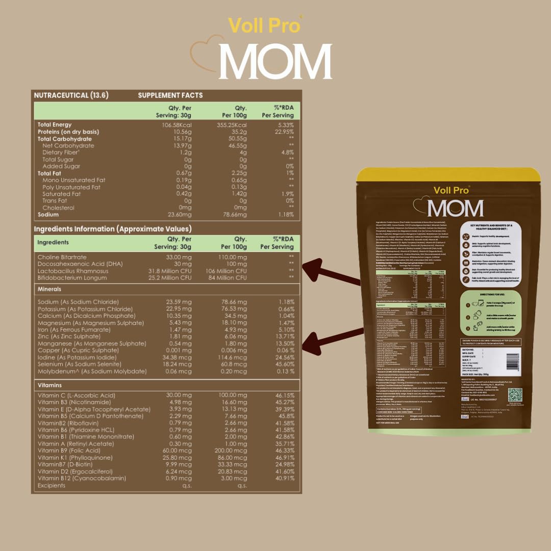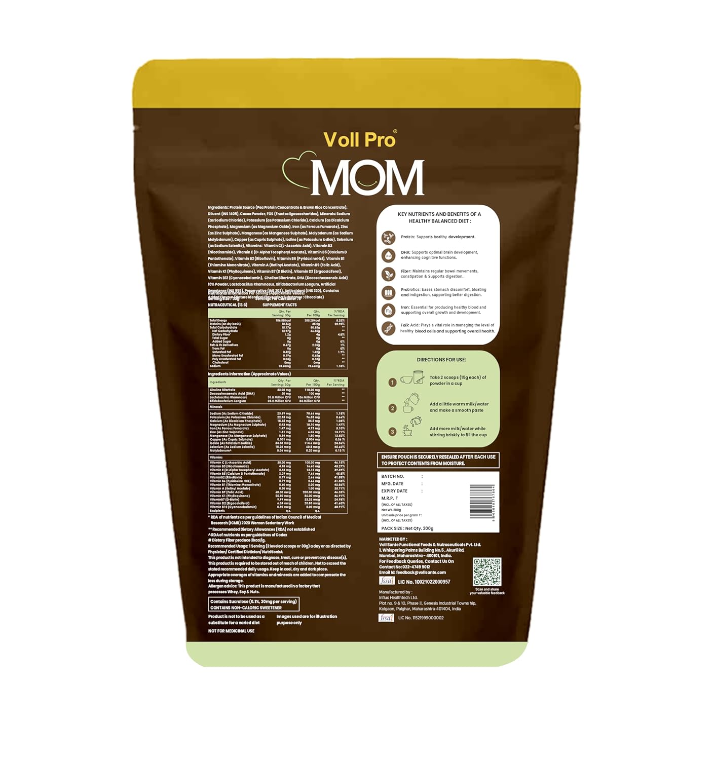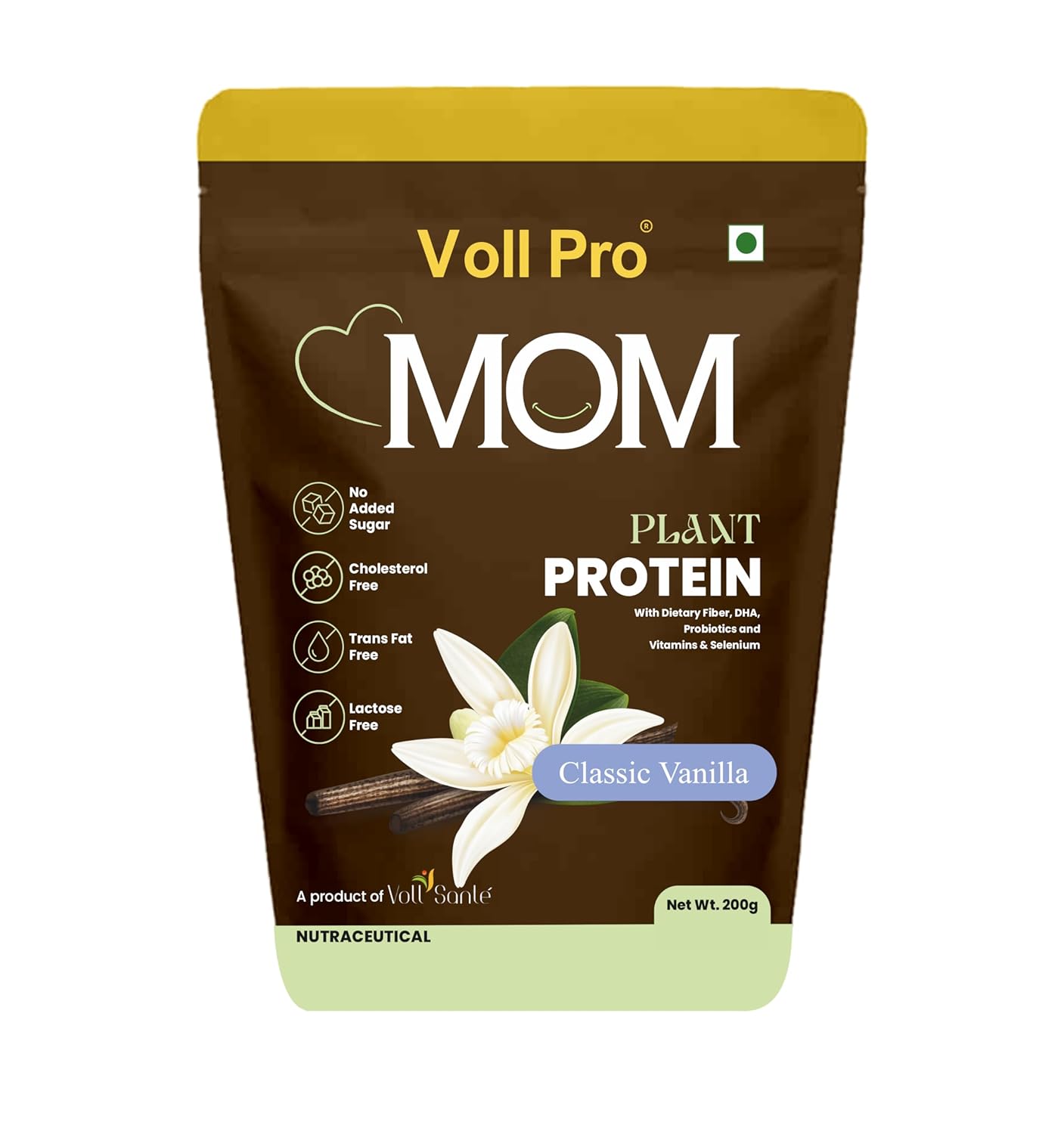 Voll Pro MOM Plant Protein Powder is a plant-based nutritional supplement designed to support mothers during and after pregnancy. Each 30g serving delivers clean protein along with dietary fiber, DHA, probiotics, multivitamins, and essential minerals to promote overall wellness. Available in Swiss Chocolate flavour , it’s lactose-free, sugar-free, and contains no cholesterol or trans fats. Easy to blend and gentle on the stomach, it's a convenient way to support your daily nutritional needs—anytime, anywhere.